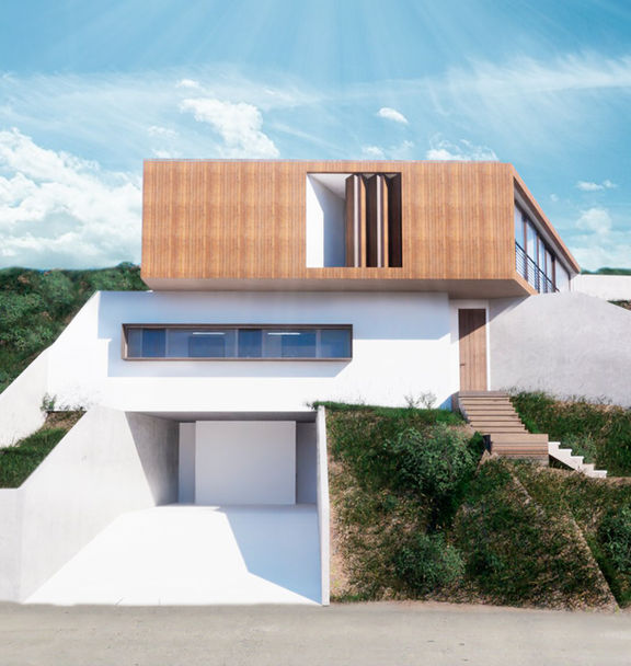 Módulo Oeste: La Reconquista del Horizonte, El volumen superior se proyecta como el contrapunto complementario del módulo este. Esta unidad, concebida como una vivienda unifamiliar completa de alta complejidad funcional, se abalcona sobre el acantilado para conquistar las visuales ininterrumpidas hacia la profundidad del mar. Su materialidad se define por la tensión de opuestos: mientras los muros masisos blancos construyen un hermetismo selectivo que protege la privacidad de los recintos, los cielos blancos y terminaciones en maderas de caoba, roble y tonos anaranjados de oregón aportan una atmósfera dinámica y una calidez táctil al conjunto.